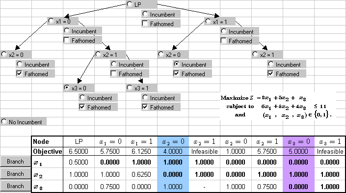 is feasible as well as integer, so it is fathomed by Test 3. Furthermore, this solution is better than the incumbent (5 > 4) , so Iteration 4 finishes by selecting the "Incumbent" button under the "x3 = 0" node.