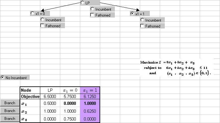subproblem cannot be fathomed (noninteger soluton, etc.). The next step is to consider the other subproblem by selecting the node labelled "x1 = 0".