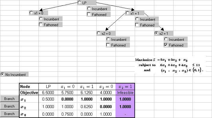 would next select the node labelled "x2 = 0" to examine the other subproblem. |